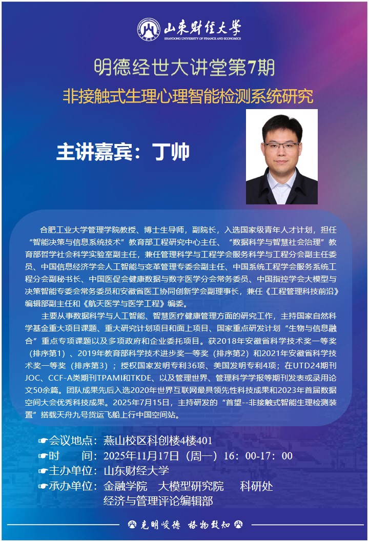 丁帅,合肥工业大学管理学院教授、博士生导师,副院长,入选国家级青年人才计划,担任"智能决策与信息系统技术”教育部工程研究中心主任、"骯峁踭农叧据科学与智慧社会治理”教育部哲学社会科学实验室副主任,兼任管理科学与工程学会服务科学与工程分会副主任委员、中国信息经济学会人工智能与变革管理专委会副主任、中国系统工程学会服务系统工程分会副秘书长、中国医促会健康数据与数字医学分会常务委员、中国指控学会大模型与决策智能专委会常务委员和安徽省医工协同创新学会副理事长,兼任《工程管理科技前沿》编辑部副主任和《航天医学与医学工程》编委。